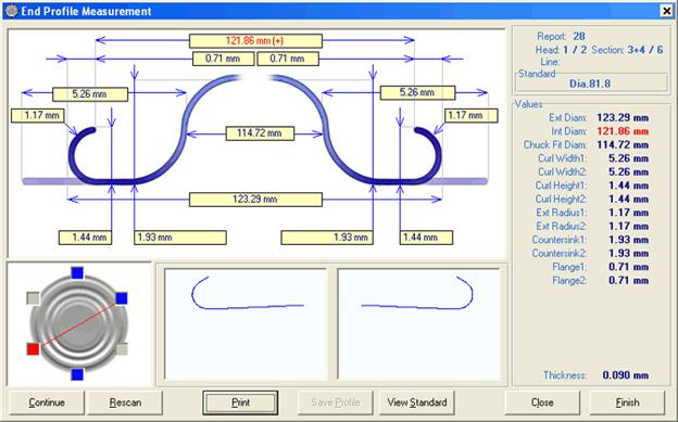 The End Profile Analyzer uses laser profiling technology in order to scan a profile of the edge of the measured can end. With laser profiling technology, the EPA is able to measure the Curl Width (along with other measurements) using a non-contact optical laser measurement system.The sanitary end is placed within the optical unit. A contact driven gauge is used to perform measurements such as external diameter. This measurement is combined with the non-contact measurements in order to produce the following measurement values: